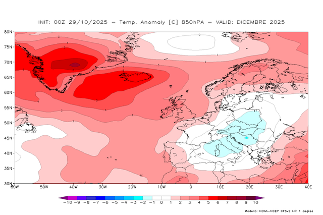 Carta delle anomalie termiche a 850 hPa (1500 m) previste dal modello CFSv2 per dicembre 2025.